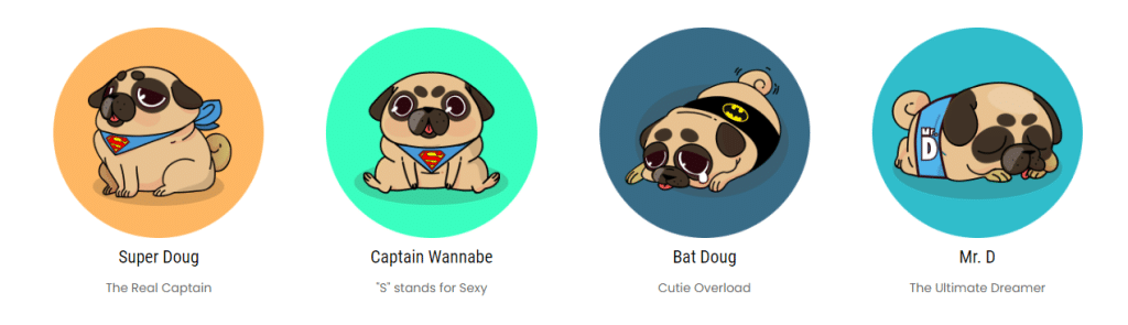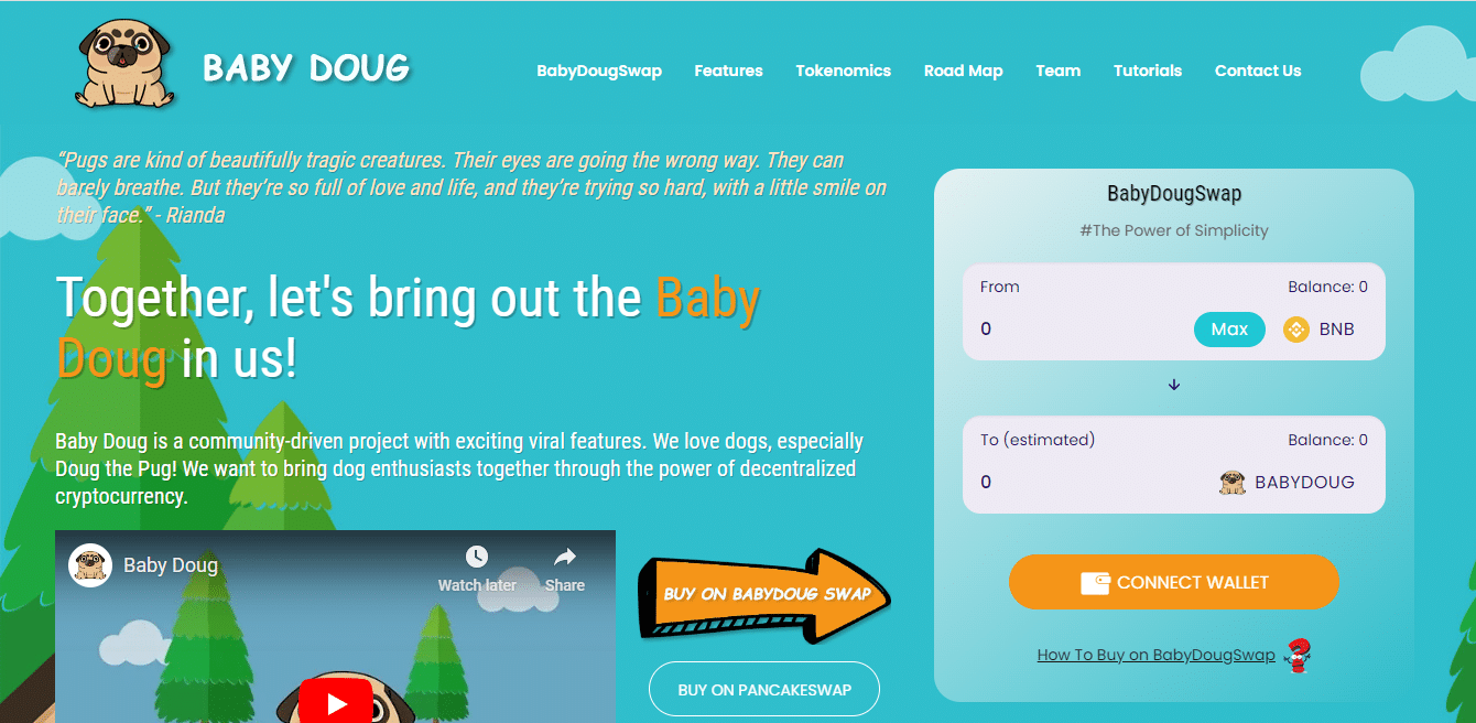Baby Doug “Pugs are kind of beautifully tragic creatures. Their eyes are going the wrong way. They can barely breathe. But they’re so full of love and life, and they’re trying so hard, with a little smile on their face. Rianda Together, let’s bring out the Baby Doug in us! Baby Doug is a community-driven project with exciting viral features. love dogs, especially Doug the Pug! they want to bring dog enthusiasts together through the power of decentralized cryptocurrency.