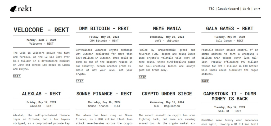 “Buying on the dip and finding out that it was only the opening of being destroyed.” “Rekt: when you disregard all advice and bet everything on a coin based on a joke.”