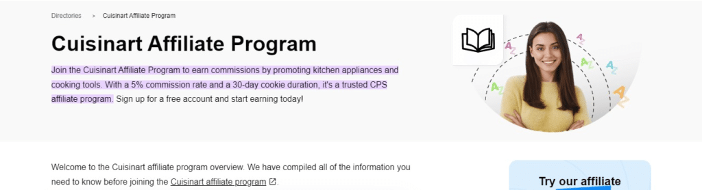 Affiliates get access to both 30-days cookie duration and promotional materials. With Cuisinart as a top-selling brand with cutting edge.
