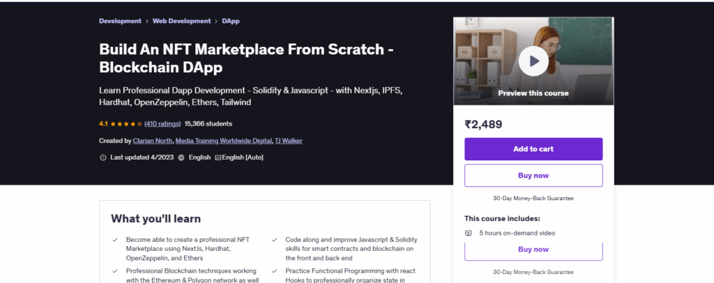 - Project-Based Learning: Offers instruction on creating an entire-fledged NFT marketplace including frontend and backend components.