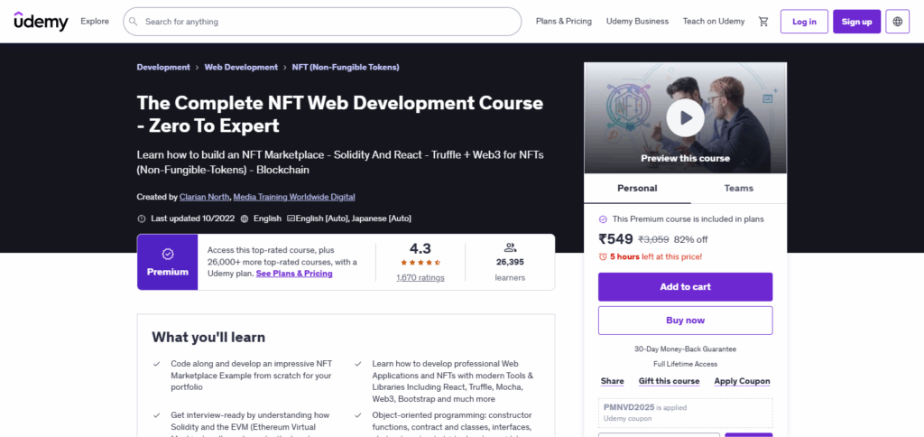 One of the most complete courses on NFTs and Blockchain technology with a hands-on approach is Build An NFT Marketplace From Scratch. Students appreciate the self-paced step-by-step instruction on wallet integration, smart contract development, and building intuitive interfaces.