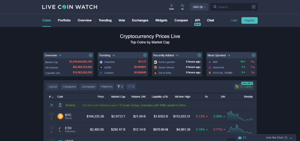 Live Coin WatchReal-time updates with customizable portfolio dashboards.