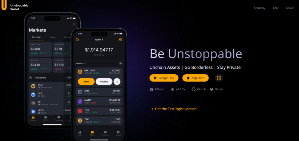 Unstoppable WalletDecentralized, multi-chain support, focus on privacy and anonymity