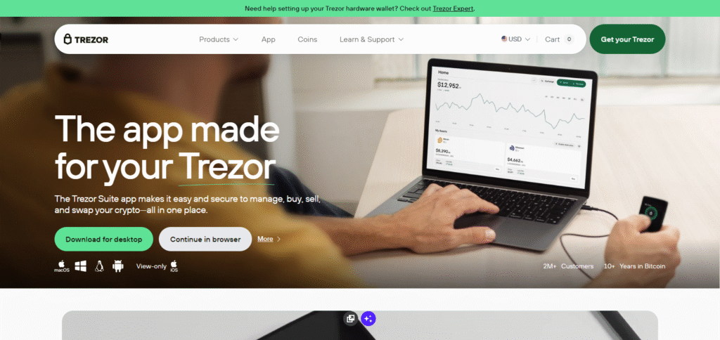 Trezor SuiteFull hardware wallet support, excellent security, multi-currency support